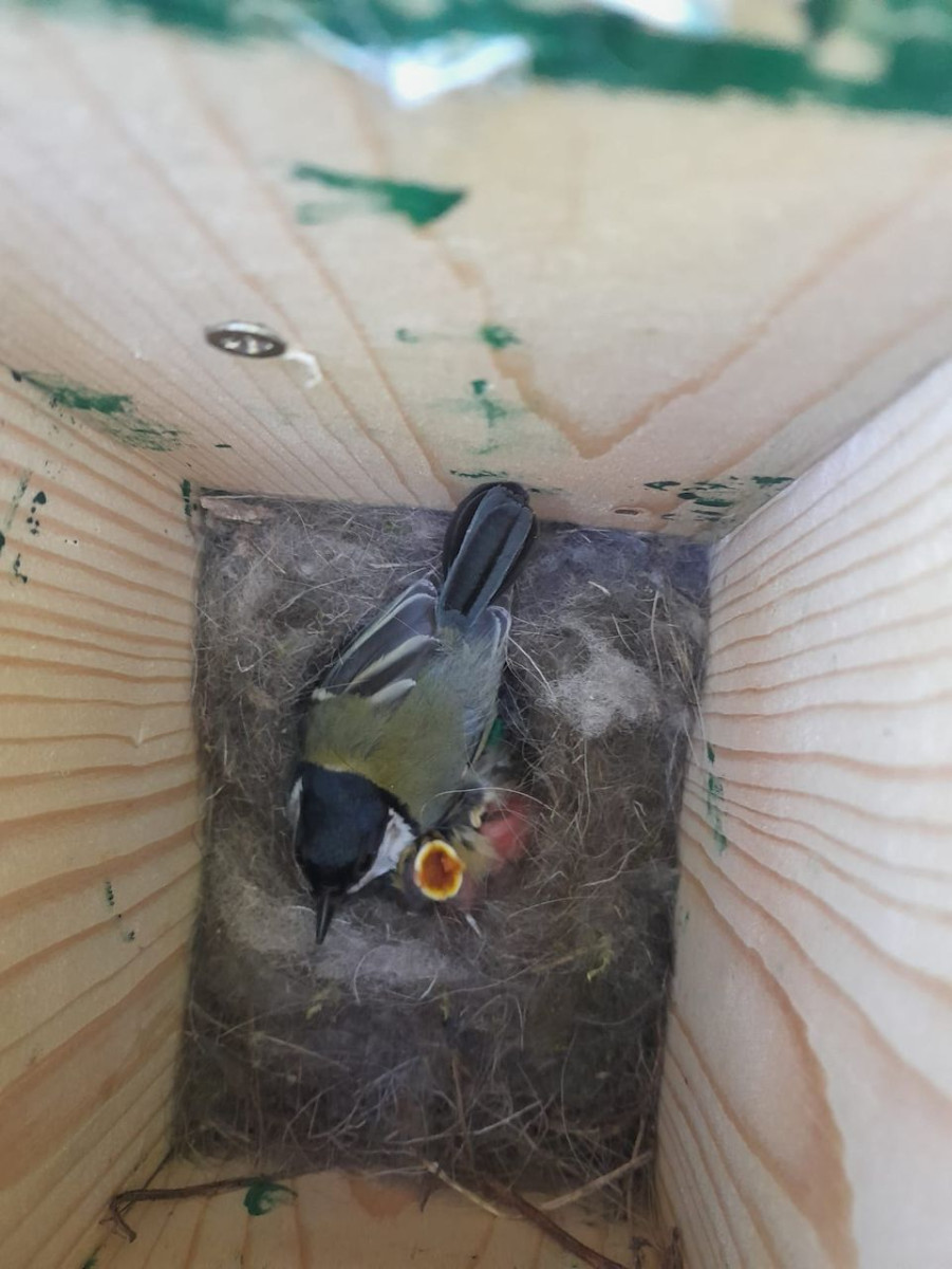Onze eigen Koolmees zit inmiddels volop te broeden. Echt druk is ze niet: het vrouwtje zit vooral geduldig en stil op de eieren om ze warm te houden. Slechts af en toe verlaat ze kort het nest om te eten, waarna ze snel weer terugkeert.