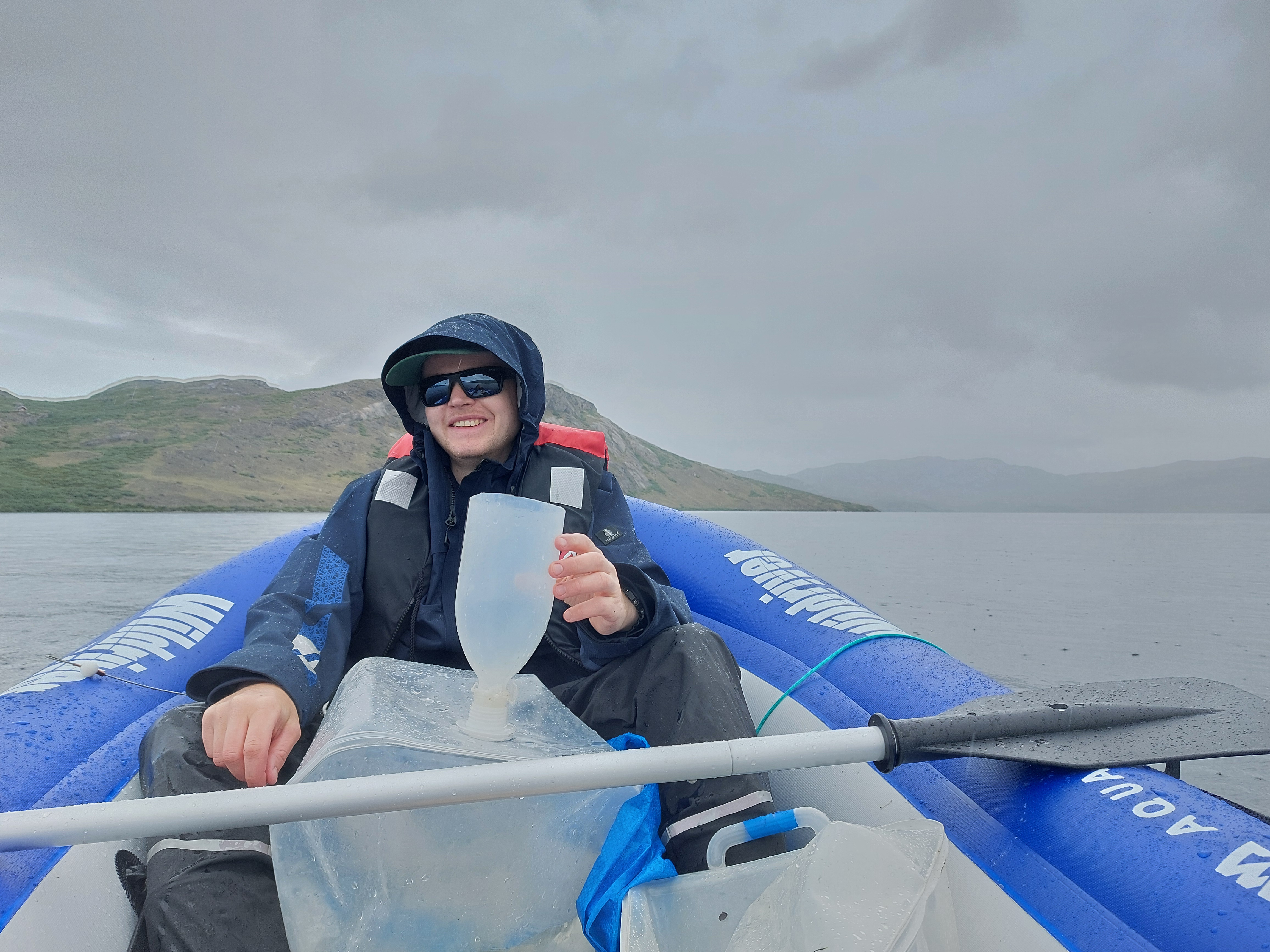 Sampling lake waters in bad weather on Lake Ferguson