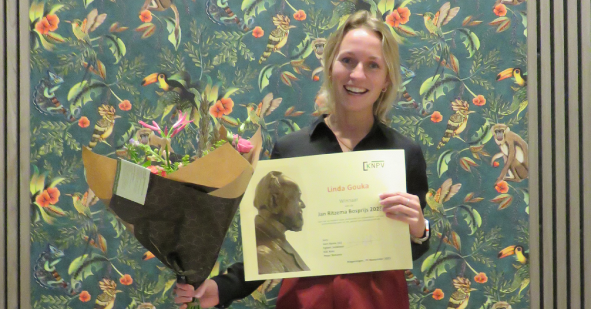 Linda Gouka heeft op 20 november de Jan Ritzema Bosprijs 2025 ontvangen. De prijs wordt toegekend aan jonge wetenschappers (promovendi) die in staat zijn om onderzoek aan een gecompliceerd wetenschappelijk vraagstuk op het gebied van plantgezondheid op een heldere manier uit te leggen aan geïnteresseerde niet-wetenschappers.