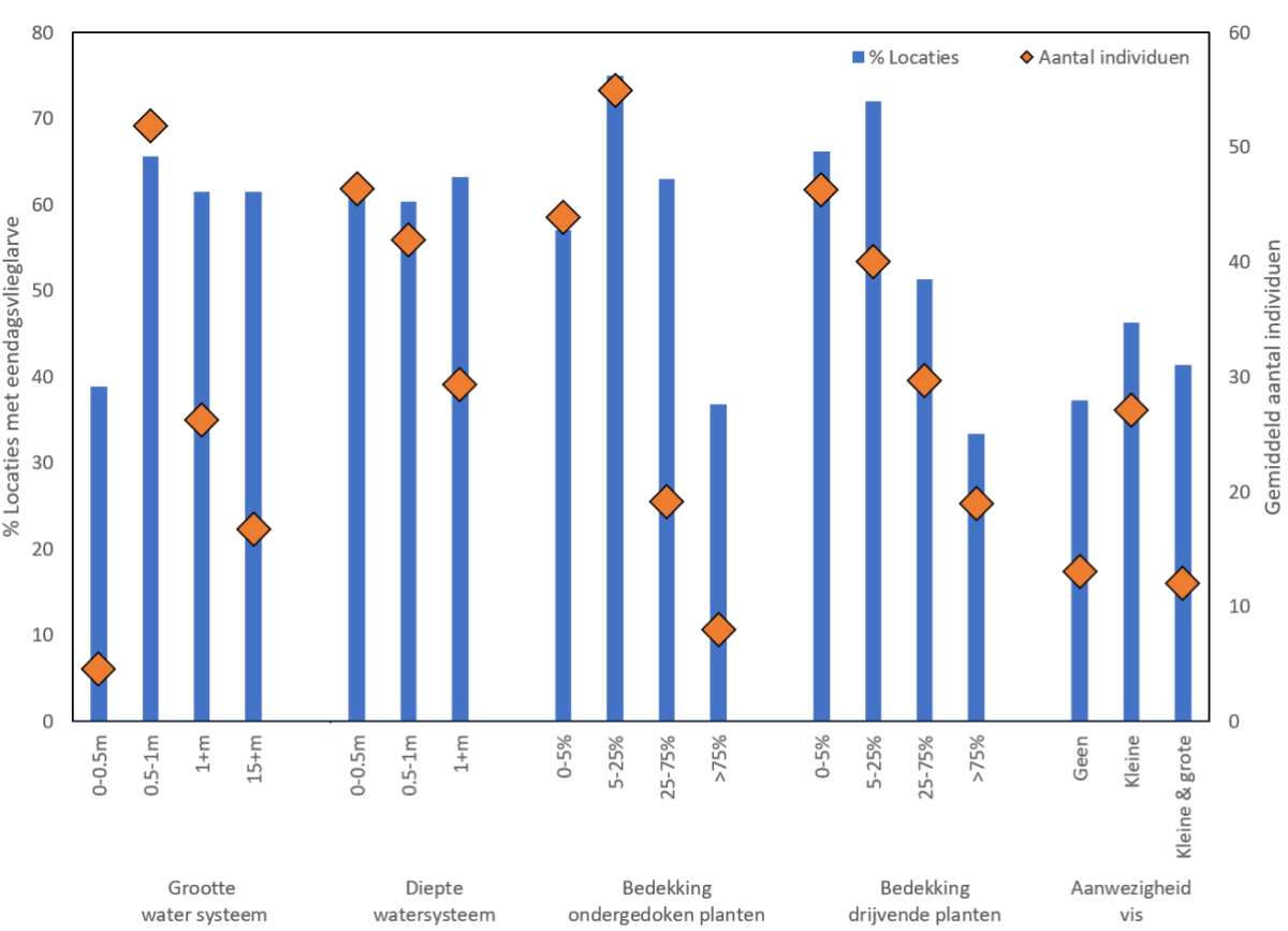 De vrijwilligers noteerden naast de waargenomen soorten ook de grootte en diepte van het bemonsterde water, en de aanwezigheid van waterplanten en vissen. Om de invloed van deze factoren op de larven van de eendagsvliegen te onderzoeken, zijn alleen de monsters met minstens vijftig waterdiertjes geanalyseerd. De waarnemingen laten zien dat het totaal aantal eendagsvlieglarven in kleine wateren (minder dan een halve meter breed) altijd veel lager is dan in andere wateren en dat ze minder vaak worden waargenomen. Daar waar de grootte van het watersysteem dus van invloed is, is dat niet het geval voor de diepte.